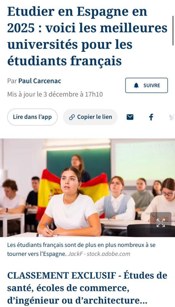 Récemment, notre accompagnement des étudiants français a été mis en avant dans un article du Figaro, soulignant l’importance d’un soutien sur mesure pour réussir son projet en Espagne. Depuis plusieurs années, nous aidons les étudiants à chaque étape : choisir la filière et l’université adaptées, faciliter les démarches administratives et réussir leur intégration.